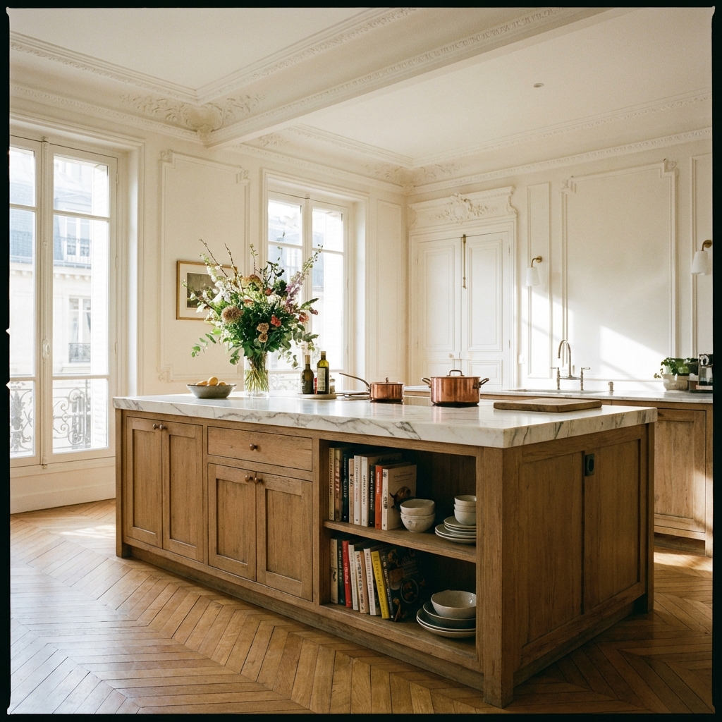 Rénovation complète d'une cuisine dans un appartement haussmannien. Le défi était d'intégrer des fonctionnalités modernes tout en respectant l'âme du lieu. Nous avons choisi une alliance audacieuse entre le chêne massif teinté et le marbre de Carrare.